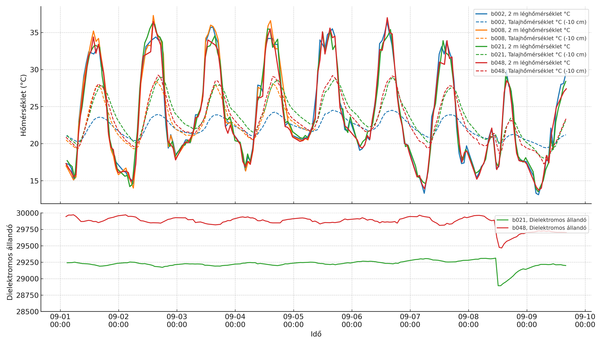 A szeptember 8-án érkező hidegfront hatására lehűlés indult meg, és ezzel egyidejűleg a b021 és b048 szenzorokon mért dielektromos állandó értékek (num_diel1) ugrásszerűen megnövekedtek. Ez a változás egyértelműen a talaj felső rétegének gyors nedvesedésére utal, amit a beérkező csapadék okozott. A dielektromos állandó érzékenyen reagál a talajnedvességre, így a görbe meredek emelkedése a felszín víztartalmának hirtelen növekedését jelzi, általánosan alkalmazott paraméter a talaj nedvességi állapotának nyomon követésére.