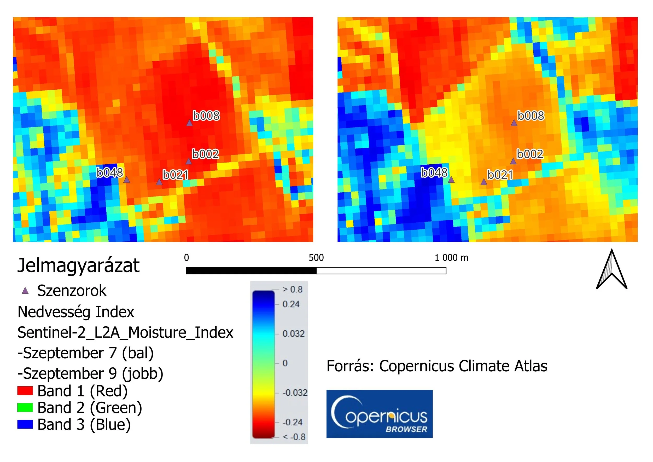 A szenzoros méréseket kiegészítik a Sentinel-2 műhold által készített NDMI (Normalized Difference Moisture Index) térképek, amelyek szeptember 7-én és 9-én készültek (Forrás: Copernicus Climate Atlas).