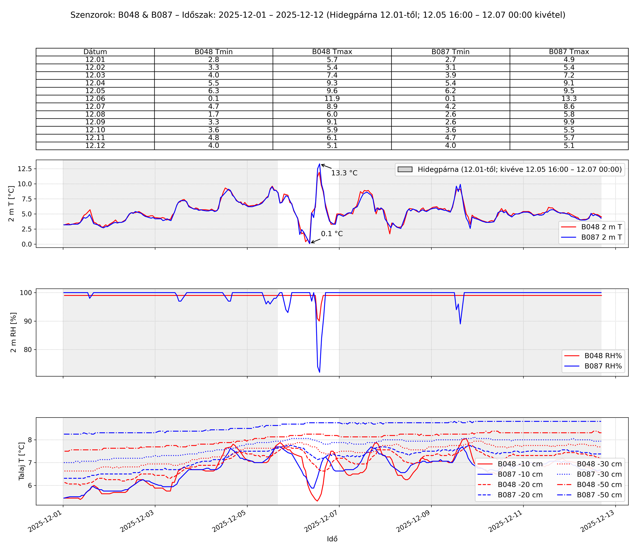 A december első felét jellemző mért adatsor szintén iskolapéldája a nálunk oly gyakori hidegpárnás időjárási helyzeteknek, ahol a napi hőingás többnyire 2–3 °C körül alakul a két méteres mérési magasságban. Jól látható, hogy a hidegpárna részleges felszakadozásával azonnal erősebben érvényesültek a be- és kisugárzási trendek, és hatodika magasságában egyazon napon beállt a vizsgált időszak napi minimuma (0 °C) és maximuma (13 °C) léghőmérséklete. A relatív páratartalom egyedül ezen időjárási ablakban hagyja el a telítettségi értéket, egyébként 100% közelében marad.