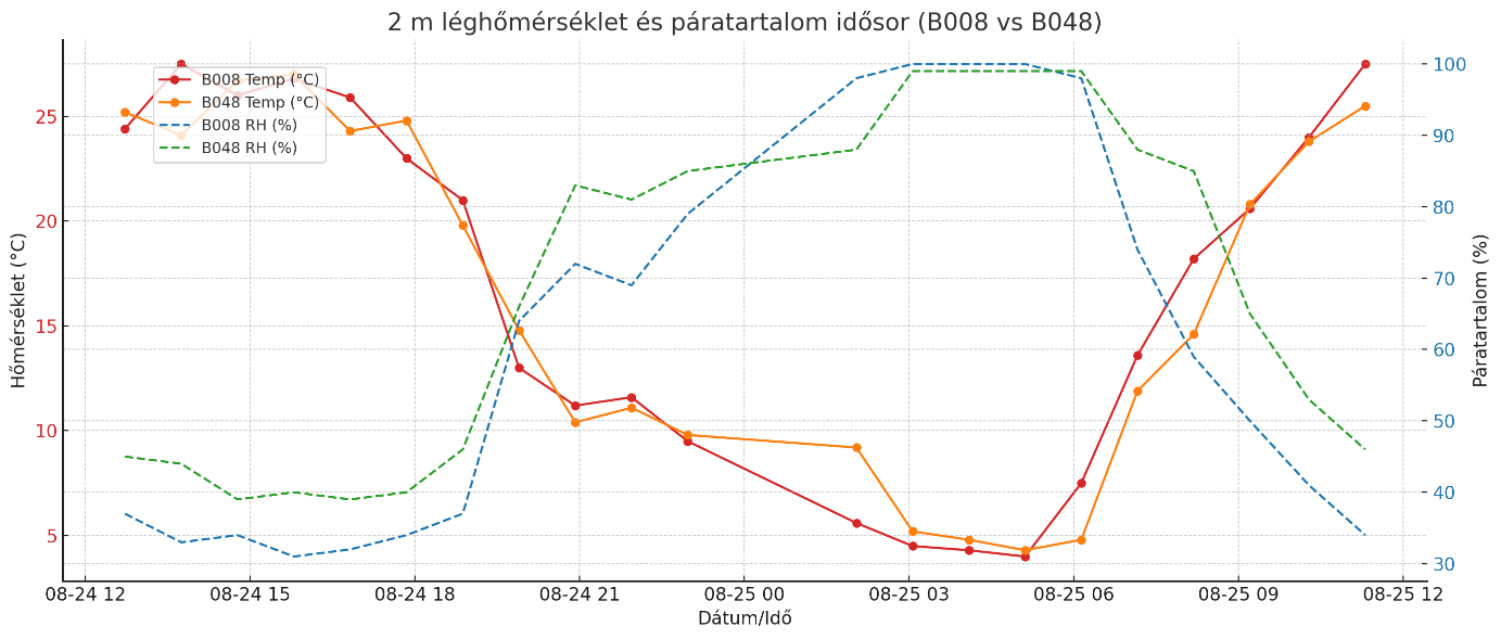 A mélyfekvésű B008-as szenzor 4,0 °C, míg a B048-as 4,3 °C-os minimumot mértek (enyhe inverzió), amelyet ezt követően a léghőmérséklet gyors emelkedése követett. A hűlési görbe jellemzően szinkronban halad, kivételt csak hajnal 2 körül tapasztalhatunk, amikor a kevésbé szélvédett, magasabban fekvő B048-as mérőpont környezetében a minimális szél általi zavarástól késleltetett hőmérséklet-csökkenés figyelhető meg. A melegedési szakaszban szintén jól kirajzolódik, hogy az árnyékosabb B048-as mérőponton később indul meg a meredek napi hőmérsékletemelkedés.
